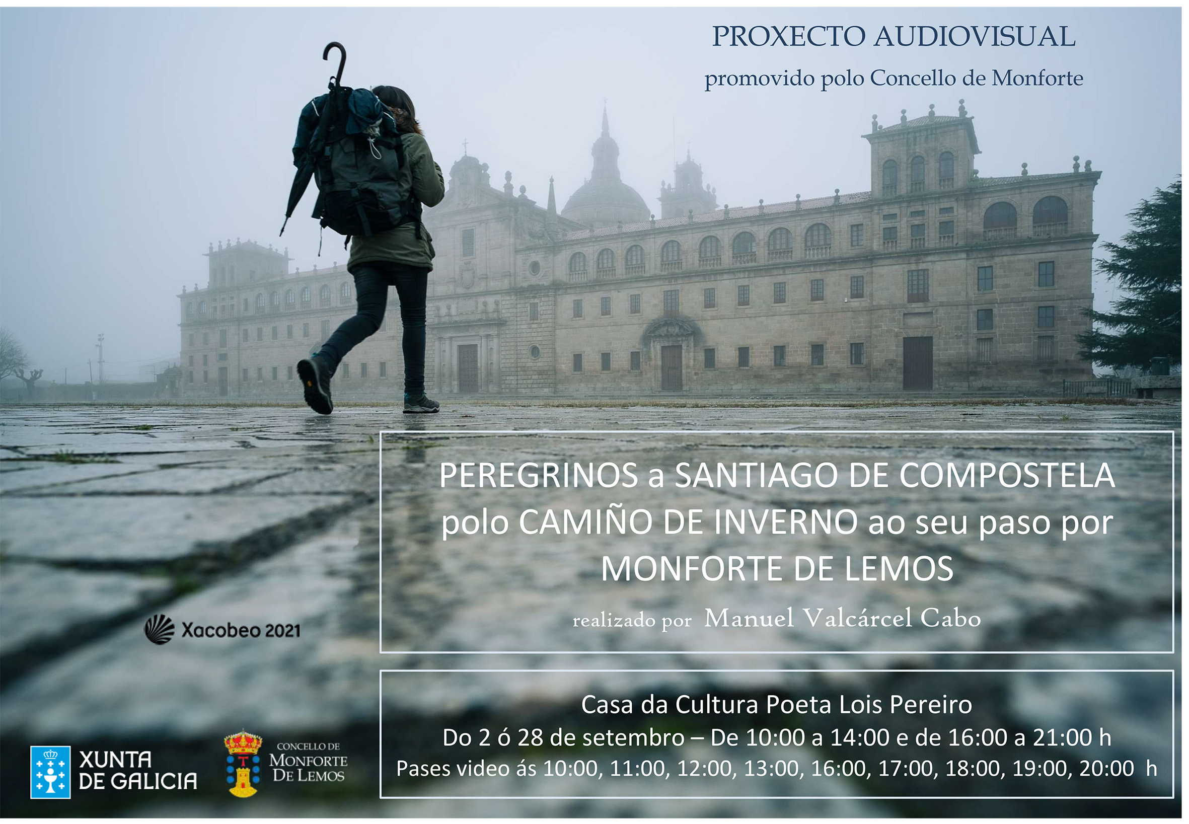 Del 2 a 28 de septiembre de 2020 y en la Sala de Exposiciones de la Casa de la Cultura Poeta Lois Pereiro del Ayuntamiento de Monforte, se pondrá a disposición del público el PROYECTO AUDIOVISUAL realizado por Manuel Valcárcel Cabo "Piro" titulado PEREGRINOS A SANTIAGO DE COMPOSTELA por el CAMINO DE INVIERNO a su paso por MONFORTE DE LEMOS.