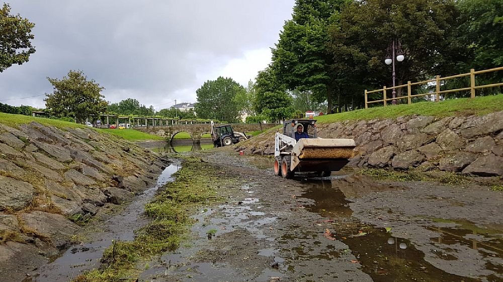 4 de Junio de 2018. Las brigadas municipales, apoyadas por la empresa Excavaciones y Transportes Ayán S.L. comenzaron esta mañana los trabajos de limpieza y acondicionamento de la laguna del Parque de los Condes, es la cuarta que se lleva adelante desde que José Tomé llegó a la Alcaldía, y que era uno de sus compromisos para mantener en buen estado esta zona de la ciudad.