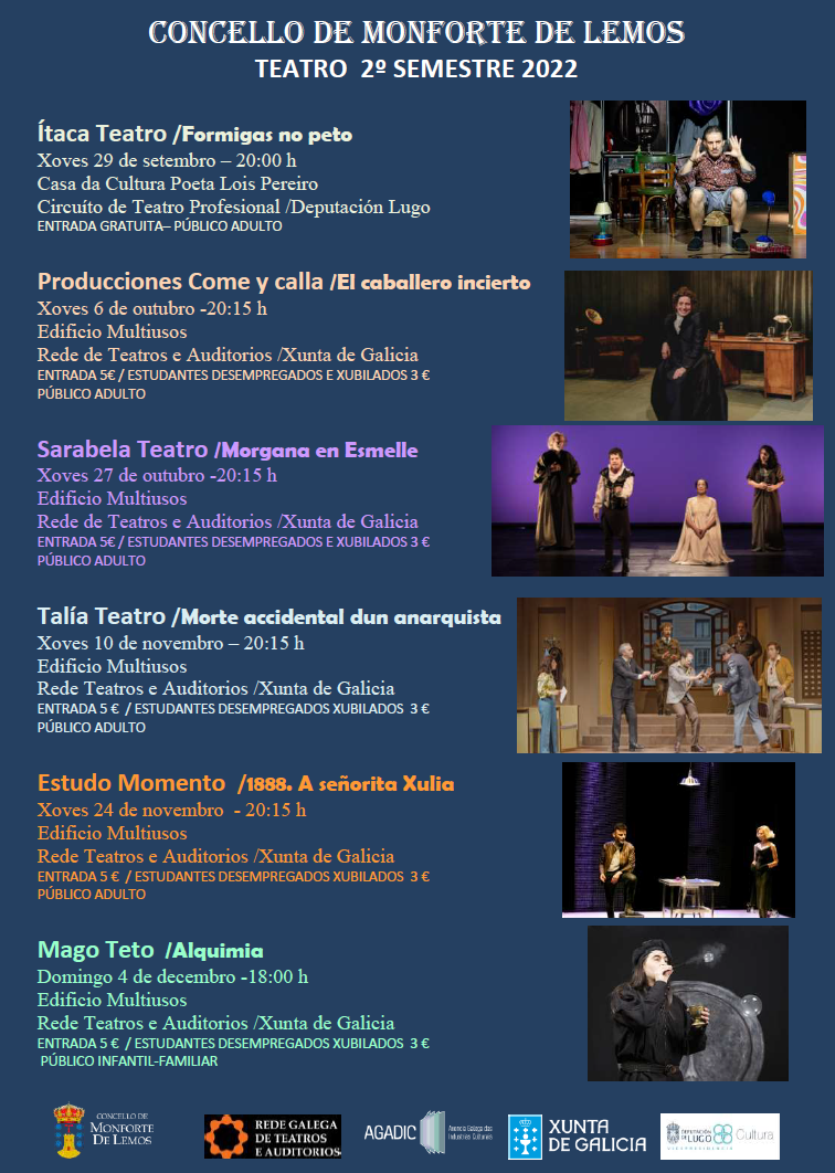 La participación del Ayuntamiento en la programación de la Red Gallega de Teatros y Auditorios de la Xunta de Galicia y en el Circuito de Teatro Profesional del área de Culura de la Diputación de Lugo, permitirá que se acerquen a Monforte las siguientes compañías y obras:
