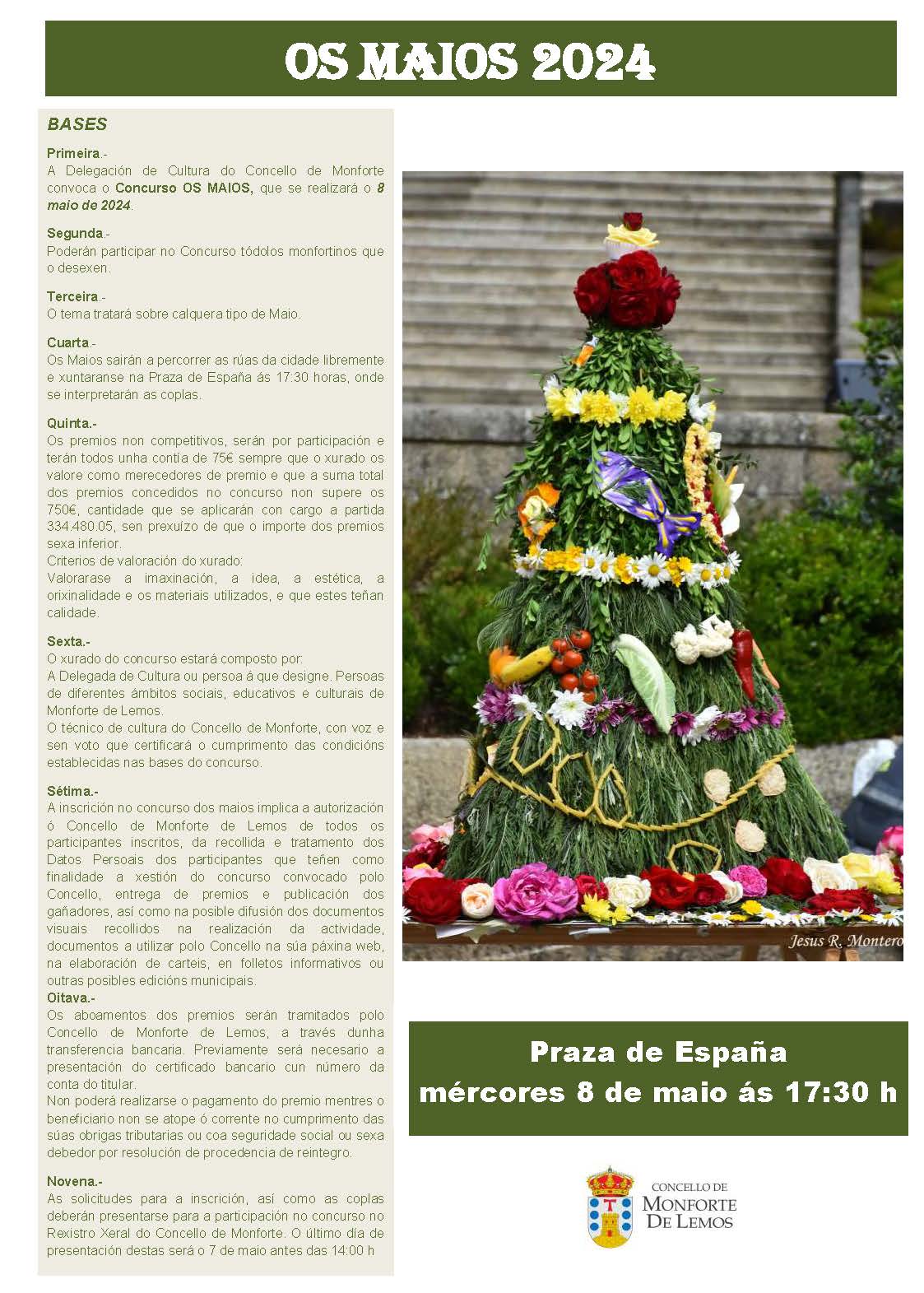 Monforte de Lemos, 16 de abril de 2024. El próximo miércoles 8 de mayo el Ayuntamiento de Monforte de Lemos celebrará una nueva edición del tradicional concurso de Los Mayos. Para ello, la concentración de los Mayos y la lectura de las coplas será en la plaza de España a las 17:30 h.