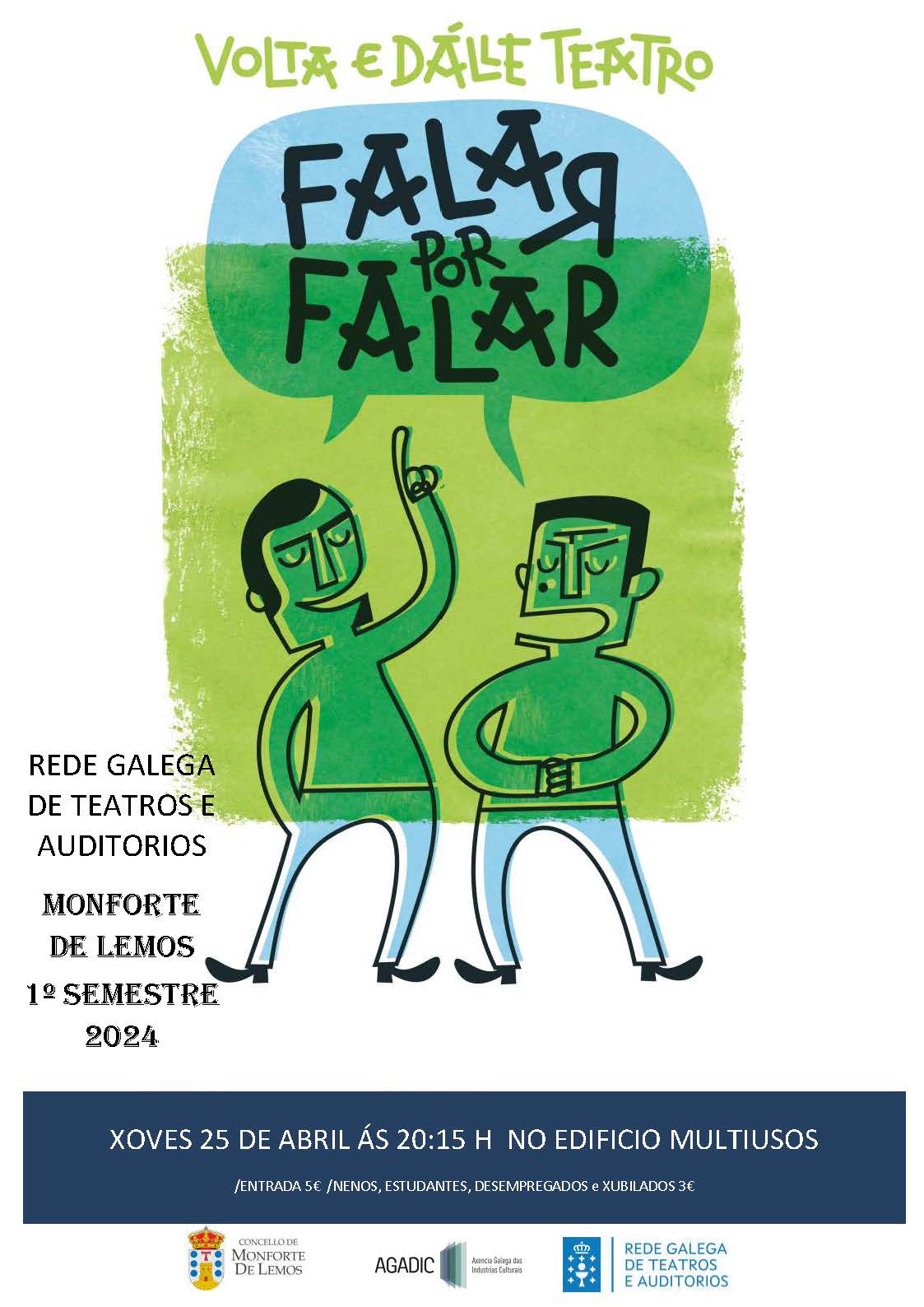 Monforte de Lemos, 22 de abril de 2024. Dentro de la programación de la Red Gallega de Teatros y Auditorios, el Ayuntamiento de Monforte programa para este jueves 25 de abril a las 20:15 en el Edificio Multiusos la puesta en escena de la obra para adultos Hablar por hablar, de la compañía Volta e Dalle Teatro, obra escrita y dirigida por Carlos Santiago e interpretada por Carlos Santiago y Victor Mosqueira.