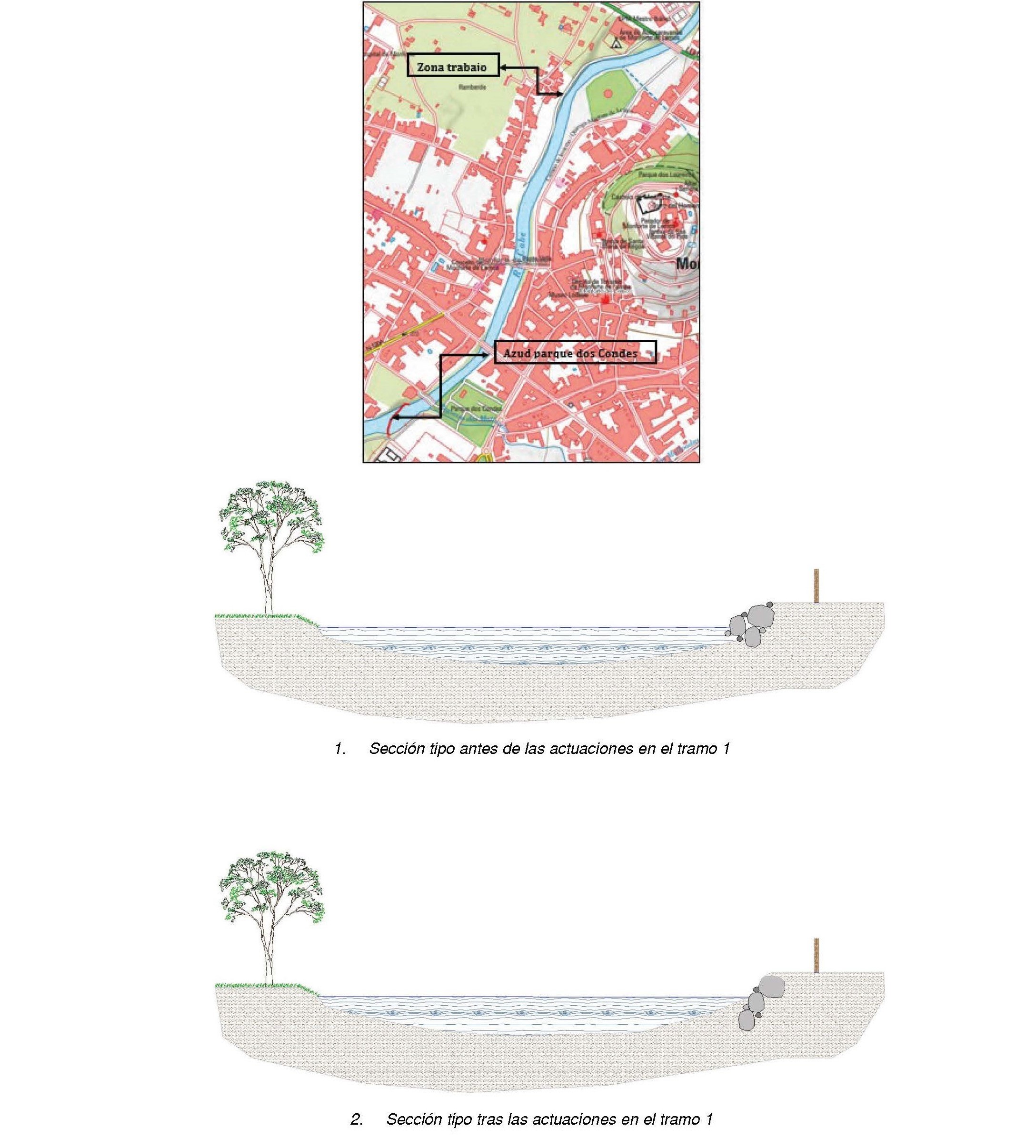 En un primer tramo se va a llevar a cabo la recuperación y estabilización del margen fluvial en un tramo de aproximadamente 30 metros de longitud mediante el uso de técnicas tradicionales. La cercanía de un paseo y la existencia de muros de fincas particulares hace necesario estabilizar este margen con técnicas constructivas tradicionales de escollera.
