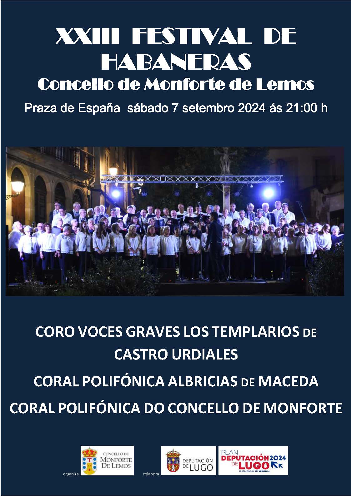 Así, la plaza de España acoge este sábado 7 de septiembre a las 21:00 horas la celebración de una de las citas clásica del verano musical monfortino, el Festival de Habaneras, que está organizado por el Equipo de Gobierno del Ayuntamiento de Monforte, y que cuenta con la colaboración de la Diputación de Lugo, a través del Plan Diputación 2024 de Cooperación con los Ayuntamientos.
