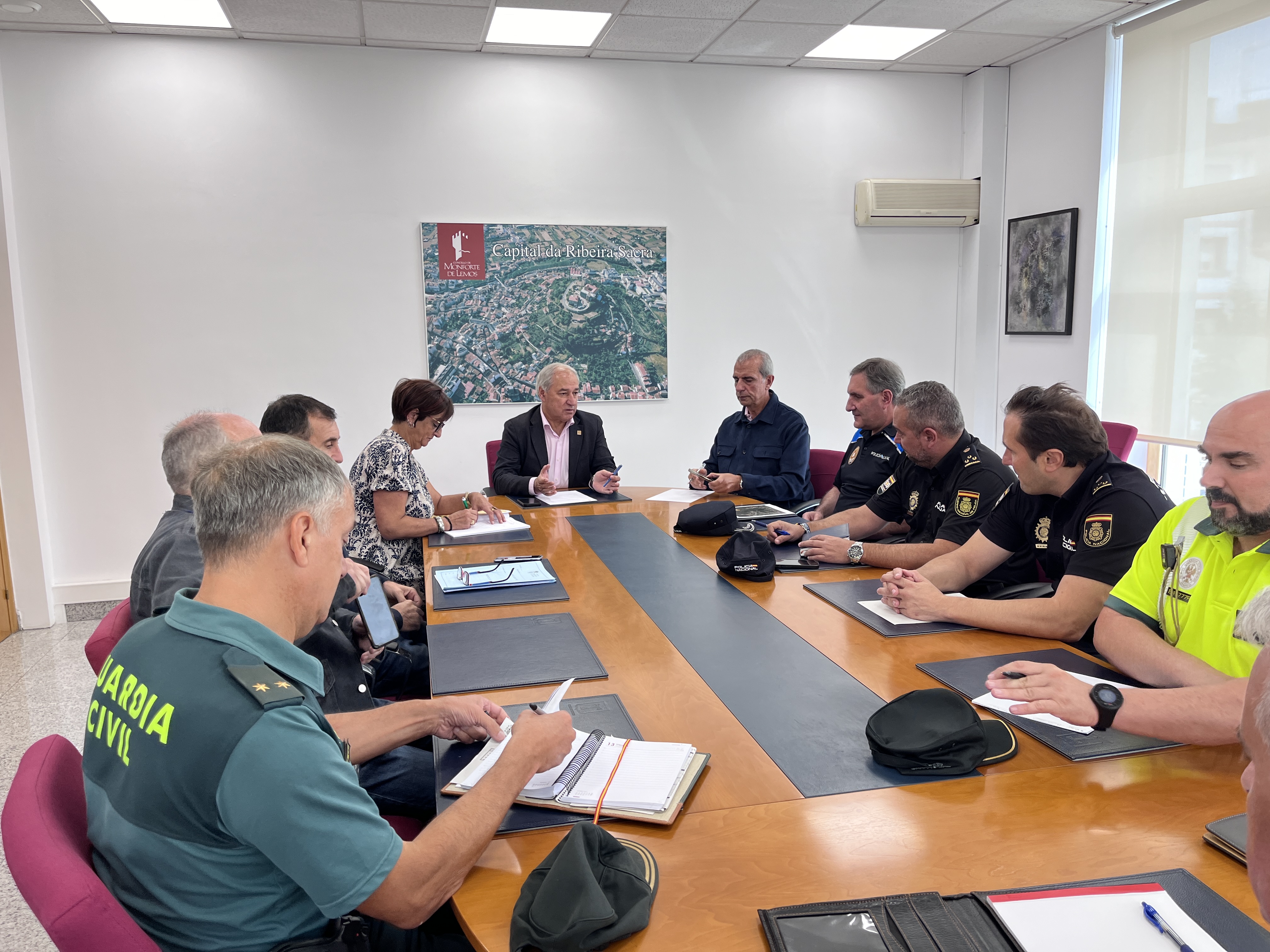 En la reunión, el Alcalde estuvo acompañado por la Teniente de Alcalde, Gloria Prada, el Secretario del Ayuntamiento, José Antonio Mourelle Cillero, el inspector de la Policía Local, Miguel Martínez, Inspector y Jefe Accidental de la Comisaria Nacional de Policía de Monforte, Celso Dacal Vázquez, el Inspector y Jefe de Seguridad Ciudadana de la Comisaria Nacional de Policía de Monforte, Óscar Fernandez Prieto, el Teniente y responsable de Seguridad Ciudadana de la Guardia Civil de Monforte, Francisco Javier González Fernández, el Sargento del Destacamento de Tráfico de la Guardia Civil de Monforte, Carlos Raúl Sánchez Álvarez, el jefe de bomberos, Tomás Losada, el jefe de Agentes de la Ciudadanía del Ayuntamiento, Manuel Fernández, y el Técnico de Medio Ambiente del Ayuntamiento, Juan Carlos Prado.