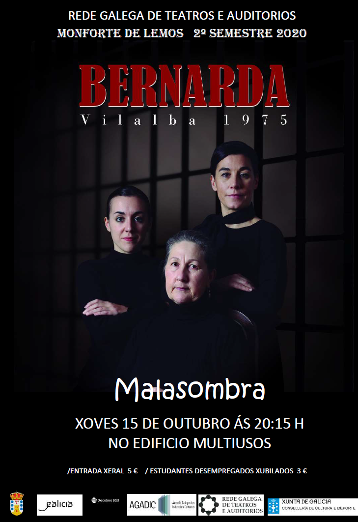 De este modo, dentro de la programación de la Red Gallega de Teatros y Auditorios correspondiente al segundo semestre de 2020 en Monforte de Lemos, este jueves 15 de octubre a las 20:15 en el Edificio Multiusos tendrá lugar la puesta en escena de la obra para adultos Bernarda, de la compañía Malasombra Producciones, obra de Jose Prieto e interpretada por Luisa Merelas, Celia González y Esther Aja.