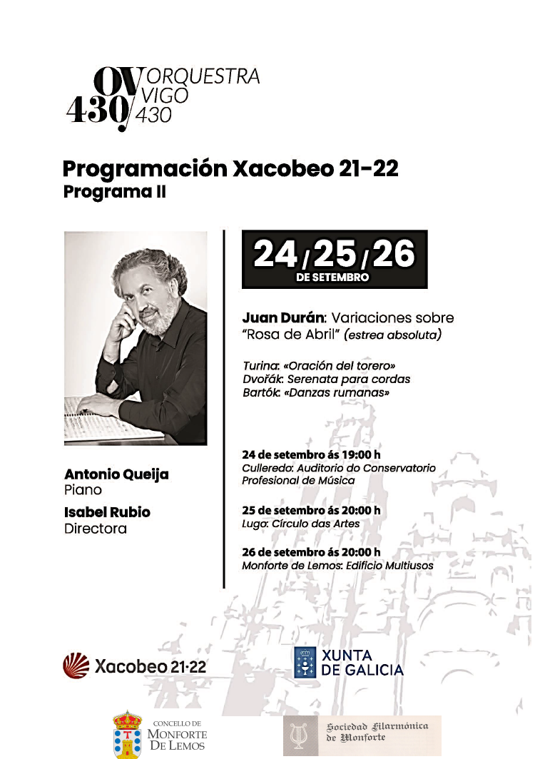 Monforte de Lemos, 23 de septiembre de 2021. El Ayuntamiento de Monforte de Lemos sigue programando actividades culturales en el mes de septiembre, y así el próximo domingo 26 de septiembre a las 20:00 h y en el Edificio Multiusos tendrá lugar un concierto de la Orquesta Vigo 430.