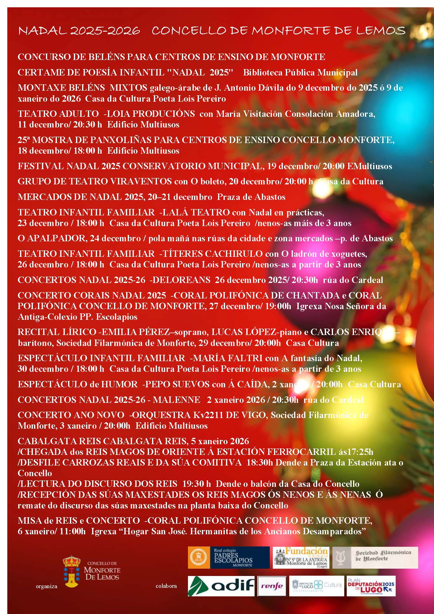 El CONCIERTO DE CORALES ‘NADAL 2025’ será el sábado 27 diciembre, a las 19.00 horas, en la Iglesia Nuestra Señora de la Antigua (colegio de los Escolapios) con las actuaciones de la Coral Polifónica de Chantada y de la Coral Polifónica del Ayuntamiento de Monforte. El lunes 29 de diciembre a las 20.00 horas, la Casa de la Cultura acogerá un RECITAL LÍRICO con la soprano Emilia Pérez, el pianista Lucas López y el barítono Carlos Enrique, en un concierto organizado por la Sociedad Filarmónica, en colaboración con el Ayuntamiento de Monforte.
