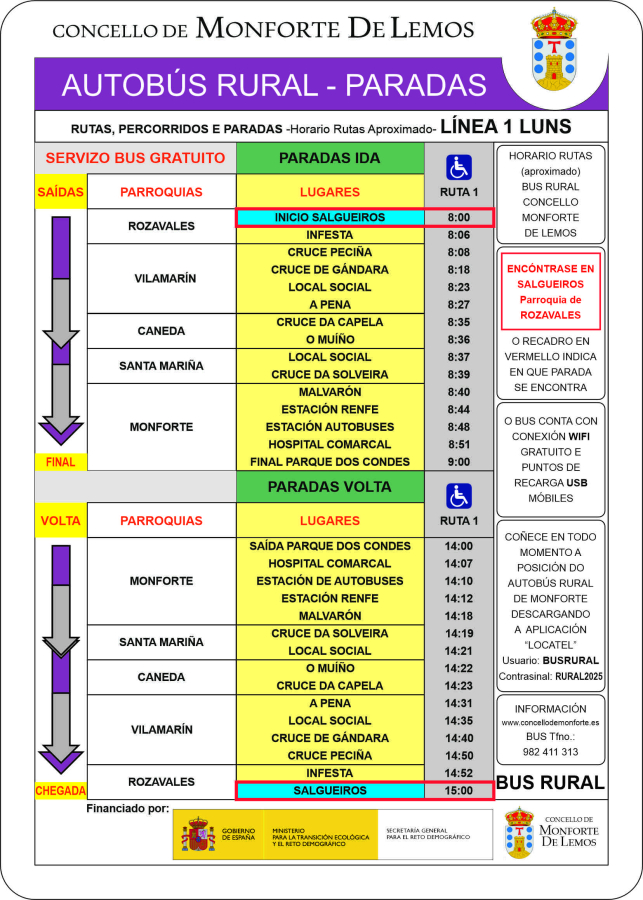 Estes horarios son sempre aproximados xa que, entre outras cousas, dependen das circunstancias diarias do tráfico. En toco caso, haberá sinalización en todas as paradas con indicativos do Bus Rural e detalle das paradas e os horarios. Ademais, o autobús conta con conexión WIFI gratuíta e puntos de recarga USB para dispositivos electrónicos. Así mesmo, os usuarios poden coñecer en todo momento a posición do Bus Rural descargando a aplicación Locatel introducindo o usuario BUSRURAL e o contrasinal RURAL2025.