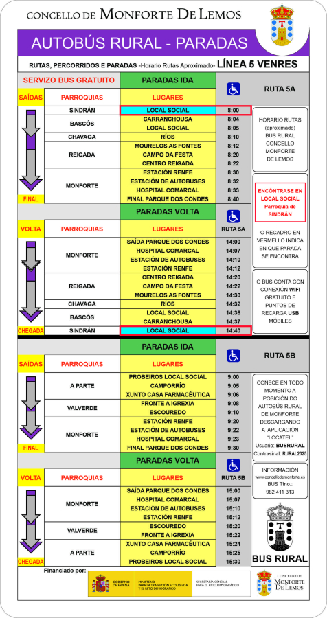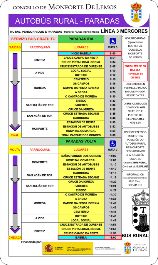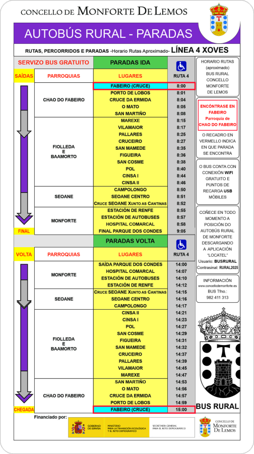 Estes horarios son sempre aproximados xa que, entre outras cousas, dependen das circunstancias diarias do tráfico. En toco caso, haberá sinalización en todas as paradas con indicativos do Bus Rural e detalle das paradas e os horarios. Ademais, o autobús conta con conexión WIFI gratuíta e puntos de recarga USB para dispositivos electrónicos. Así mesmo, os usuarios poden coñecer en todo momento a posición do Bus Rural descargando a aplicación Locatel introducindo o usuario BUSRURAL e o contrasinal RURAL2025.