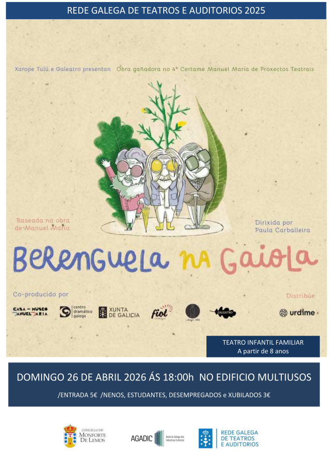 | TEATRO INFANTIL Y FAMILIAR EN EL EDIFICIO MULTIUSOS /DOMINGO 26 DE ABRIL DE 2026 A LAS 18:00h, GALEATRO PRODUCIÓNS ESCÉNICAS presenta BERENGUELA NA GAIOLA |