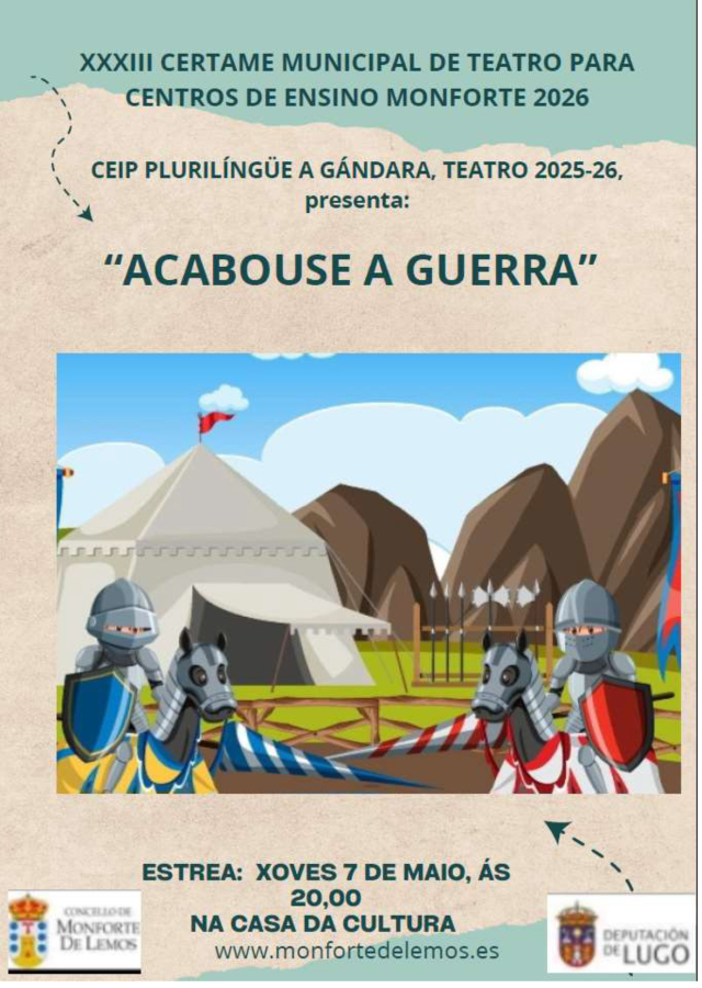 | XXXIII CERTAME MUNICIPAL DE TEATRO PARA CENTROS DE ENSINO DA CIDADE 2026 CEIP A Gándara 7 de maio de 2026 ás 20:00 na Casa da Cultura Poeta Lois Pereiro coa obra Acabouse a guerra |