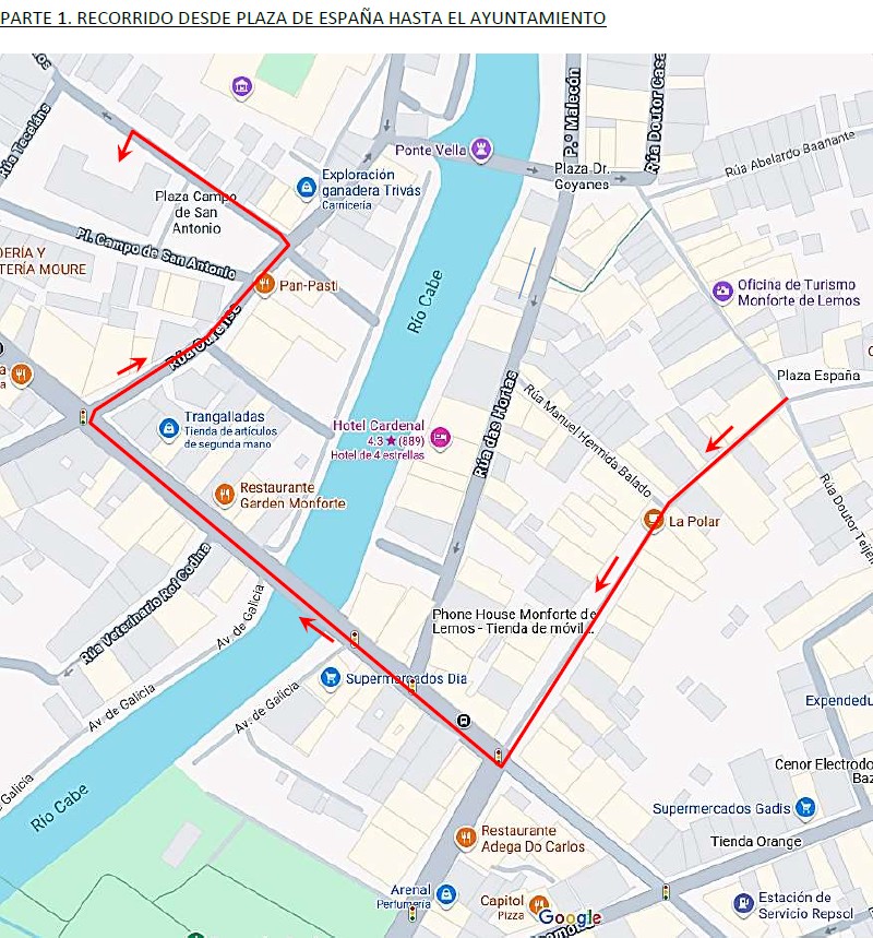 Entre as 20.30 e as 20.45h estarán afectadas a Avenida de Galicia, entre os cruces do Cardenal peonil e a Rúa Ourense, a saída da Rúa Hortas cara a Avenida de Galicia, a Rúa Ourense desde o cruce coa Rúa Chantada ata o Campo de San Antonio e Campo de San Antonio.