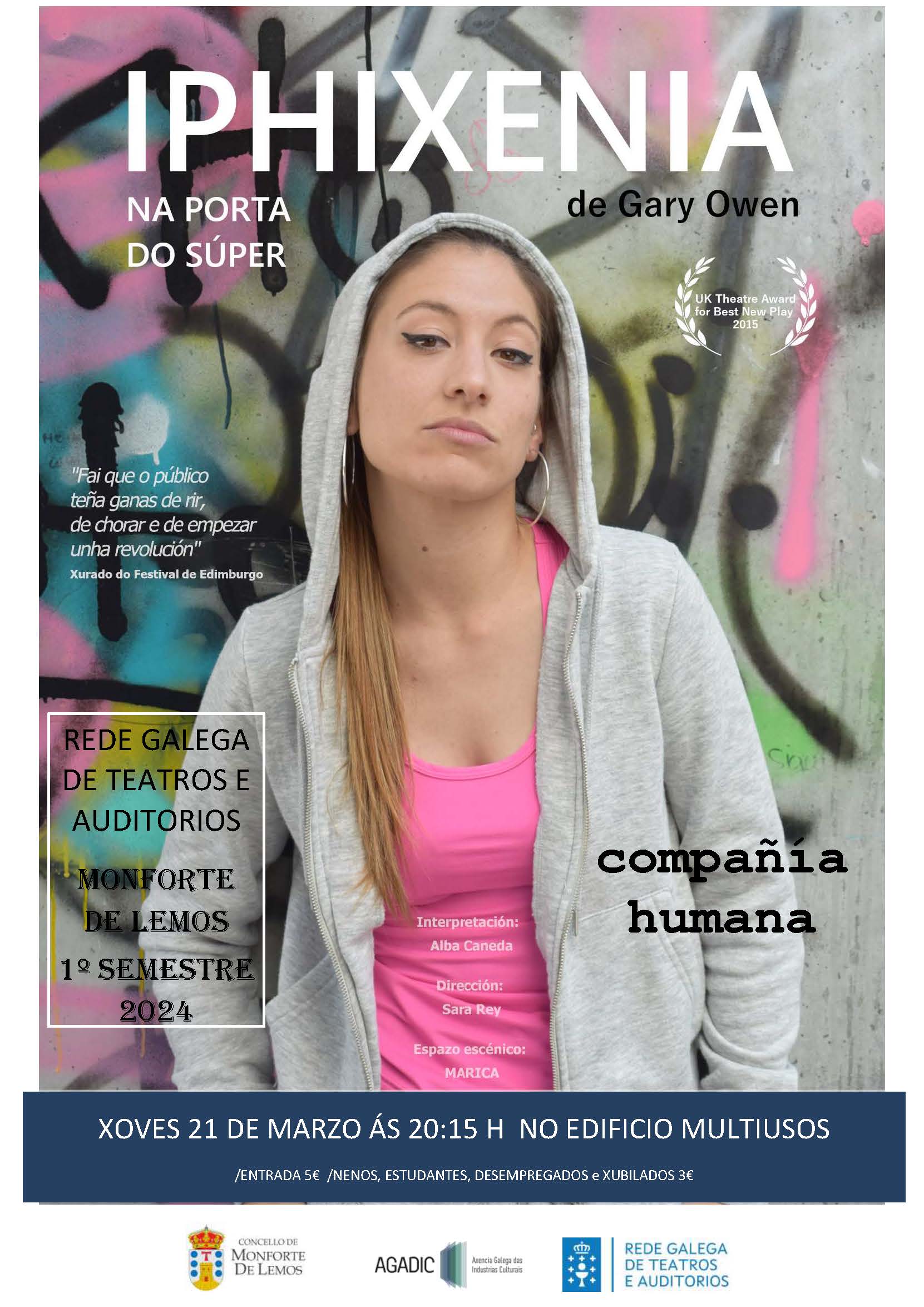 Monforte de Lemos, 18 de marzo de 2024. Dentro da programación da Rede Galega de Teatros e Auditorios, o Concello de Monforte programa para este xoves 21 de marzo ás 20:15 no Edificio Multiusos a posta en escena da obra para adultos Iphixenia na porta do súper, de Compañía Humana, obra escrita por Gary Owen, dirixida por Sara Rey e interpretada por Alba Caneda.