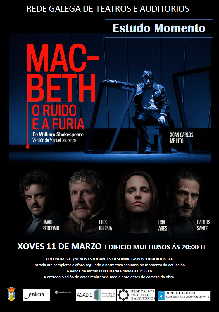 Deste xeito, dentro da programación da Rede Galega de Teatros e Auditorios correspondente ó primeiro semestre de 2021 en Monforte de Lemos, este xoves 11 de marzo ás 20:00 no Edificio Multiusos terá lugar a posta en escena da terceira das obras previstas para adultos: Macbech. O ruído e a furia, da compañía Estudo Momento. Trátase dunha adaptación en verso, a cargo de Manuel Lourenzo, da grande traxedia celta de William Shakespeare. A obra está protagonizada polos actores Xoán Carlos Mejuto, Luis Iglesia, Iria Ares, Carlos Sante e David Perdomo.