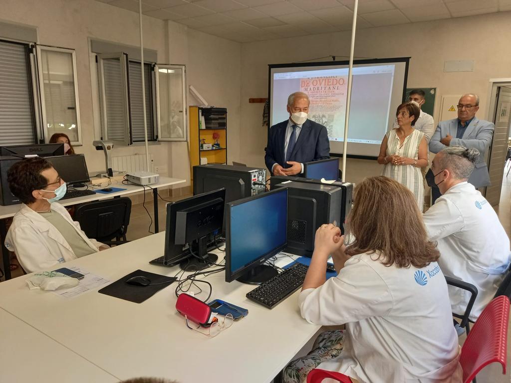 Monforte de Lemos, 14 de xullo de 2022. O Alcalde de Monforte, José Tomé Roca, visitou ós 20 alumnos e alumnas que participan no Obradoiro de Emprego Arquivo Dixital-TIC, que se celebrou dende o mes de outubro de 2021 nas instalacións da Escola Taller da Pinguela, rehabilitada nos dous obradoiros de emprego municipais anteriores, e que pasou a ser o lugar de traballo dos novos obradoiros desenvoltos polo Concello.
