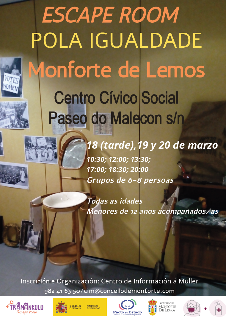 Monforte de Lemos, 16 de marzo de 2022. Seguindo ca Programación de actividades que a Concellaría de Muller e Igualdade de Monforte, a través do Centro de Información á Muller, ten organizadas para conmemorar o 8 de Marzo “Día Internacional da Muller”, esta fin de semana terá lugar un Escape Room pola Igualdade.