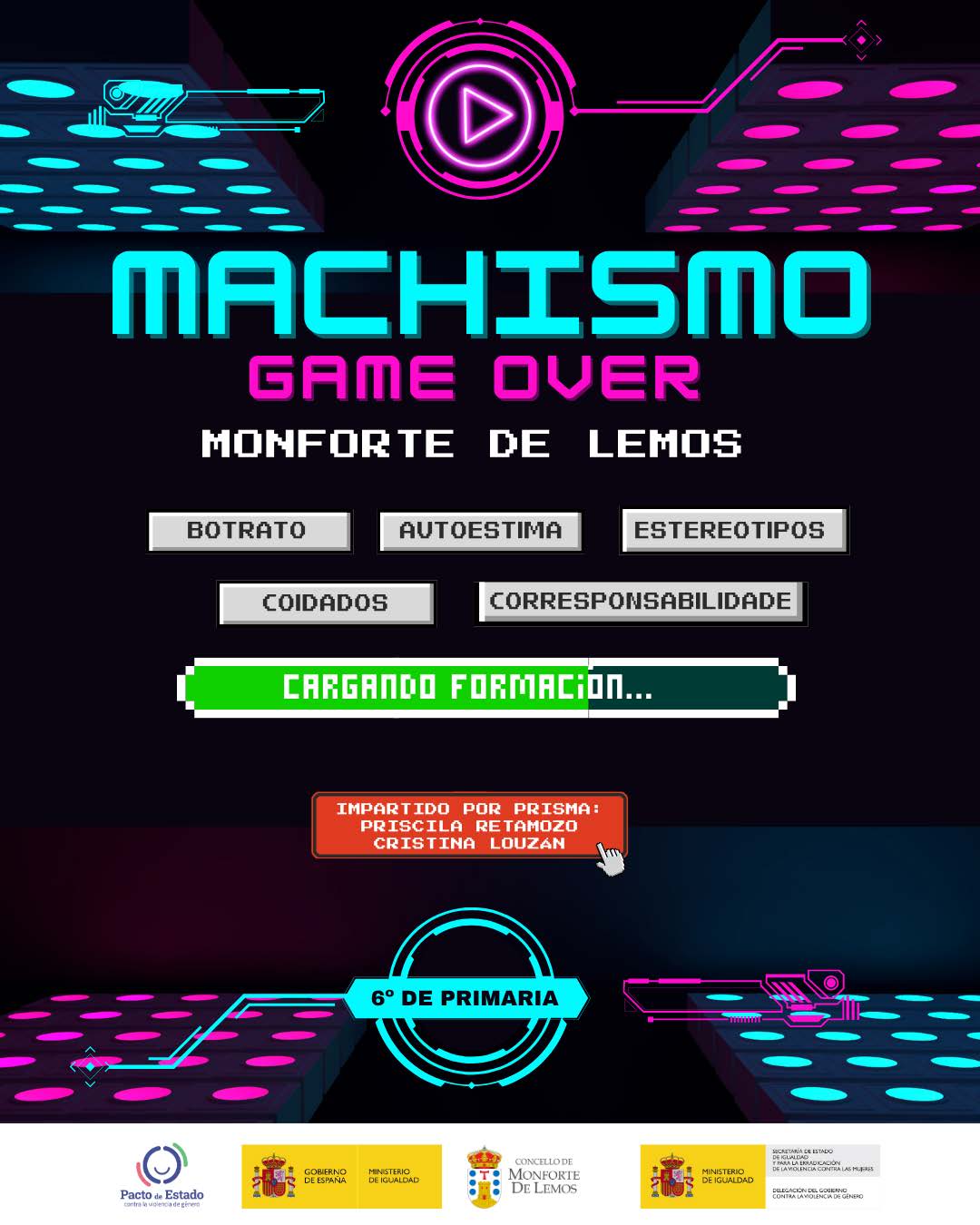 Desde o luns 10 e ata o venres 21 desenvólvese nos centros educativos o obradoiro “Machismo Game Over”, dirixido ao alumnado de 6º de Primaria, co que se pretenden revisar os roles de xénero e construír unha mirada coeducativa e igualitaria a favor do bo trato e contra a discriminación. As encargadas de levar a cabo esta actuación son Priscila Retamozo Ramos, formadora en igualdade e diversidade con alumando de todos os niveis educativos, profesorado, familias e entidades, e Cristina Louzán García, axente de igualdade especializada en teoría feminista e prevención da violencia contra as mulleres.