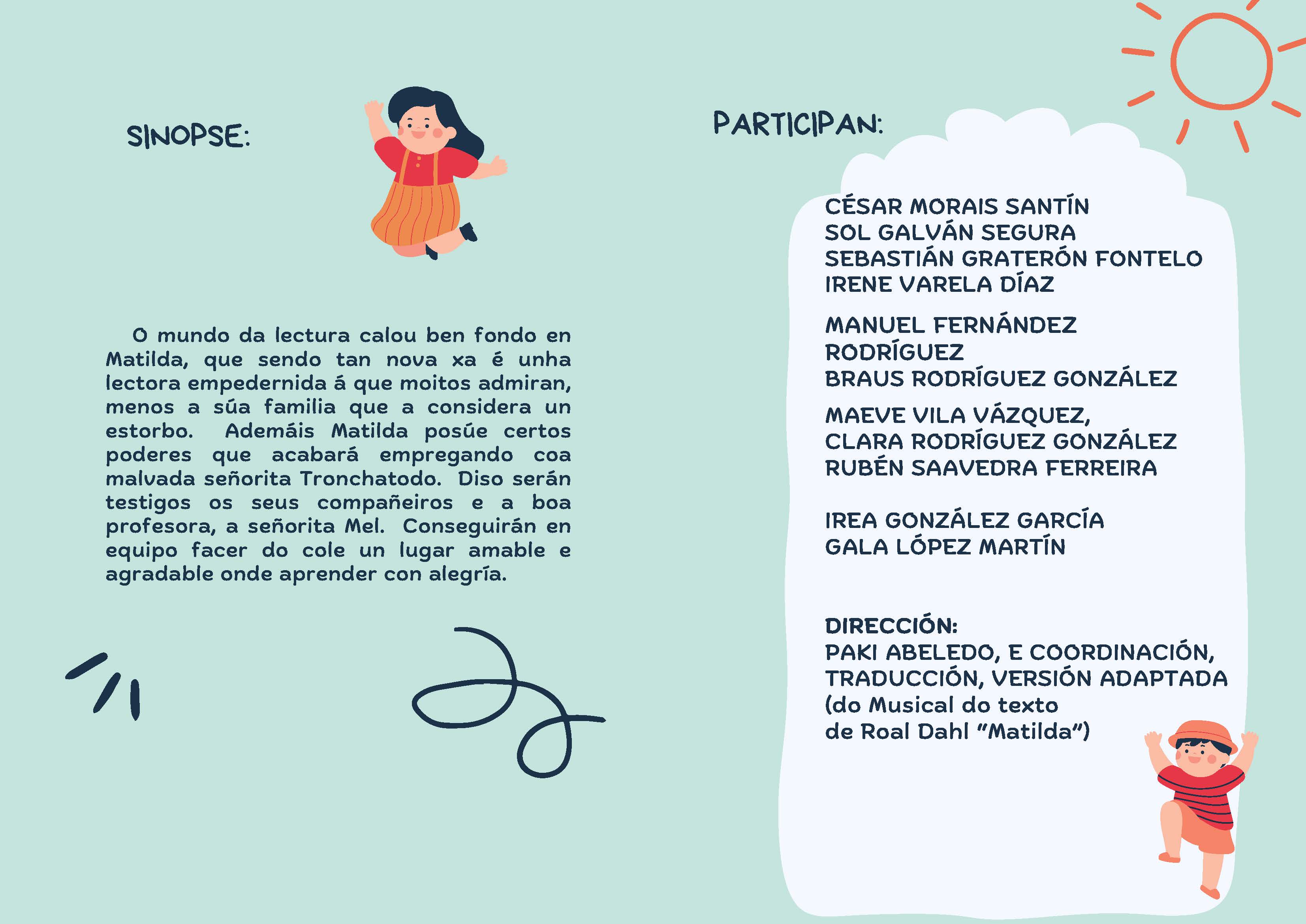 Esta tarde, ás 20:00 horas, unha nova representación, Matilda, terá lugar na Casa da Cultura Poeta Lois Pereiro, interpretada nesta ocasión polo CPR Ferroviario. Na sinopse da obra destacan o seguinte contido: “O mundo da lectura calou ben fondo en Matilda, que sendo tan nova xa é unha lectora empedernida á que moitos admiran, menos a súa familia que a considera un estorbo. Ademais Matilda posúe certos poderes que acabará empregando coa malvada señorita Tronchatodo. Diso serán testigos os seus compañeiros e a boa profesora, a señorita Mel. Conseguirán en equipo facer do cole un lugar amable e agradable onde aprender con alegría”.