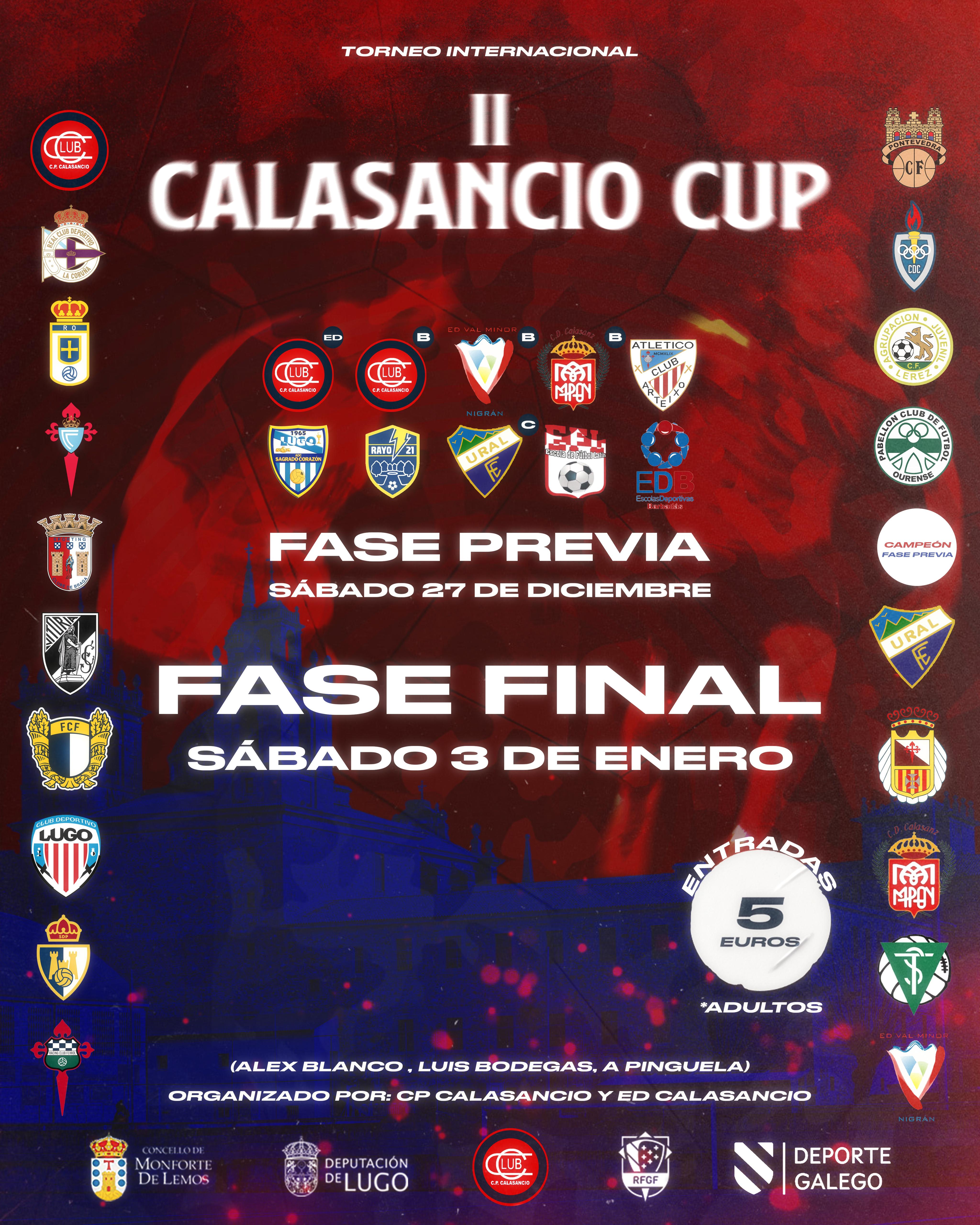 Monforte de Lemos, 16 de decembro de 2025. Monforte de Lemos acollerá este Nadal a segunda edición da Calasancio Cup, un torneo que reunirá na nosa cidade a equipos de máximo nivel no fútbol infantil sub-14 do noroeste peninsular. A competición, organizada polo CP Calasancio coa colaboración do Concello de Monforte, celebrarase en dúas xornadas os días 27 de decembro e 3 de xaneiro, con equipos de Galicia, Asturias, Castilla y León e Portugal.