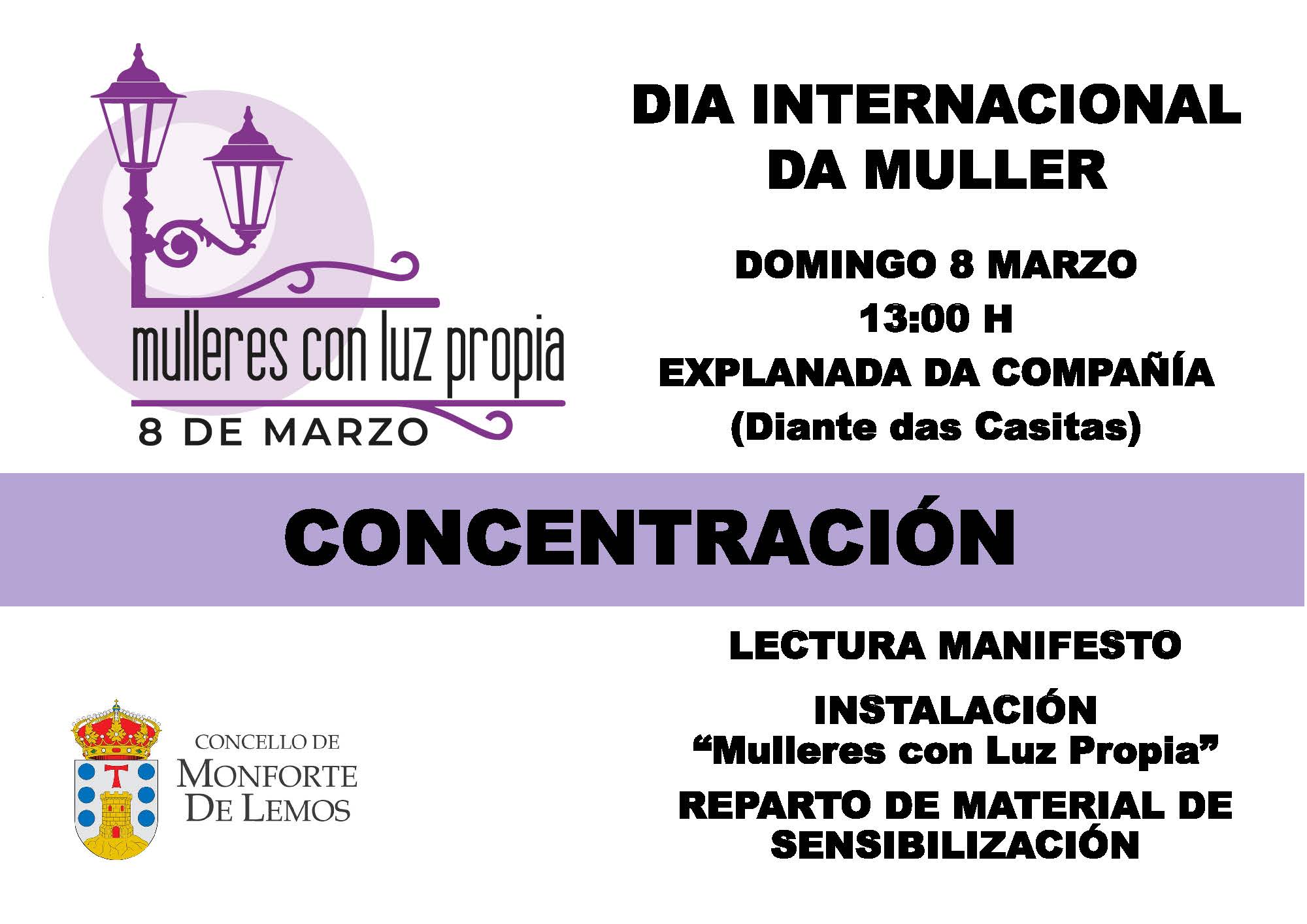 Do mesmo xeito, e coa finalidade sensibilizar e facer un chamamento a toda a sociedade monfortina, desde o pasado luns, 2 de marzo, o Bus Urbano leva un vinilo para animar a asistir á concentración do 8 de marzo e sensibilizar á cidadanía monfortina perante a reivindicación da igualdade real de dereitos, oportunidades e participación das mulleres na sociedade, así como para eliminar a discriminación e violencia de xénero.