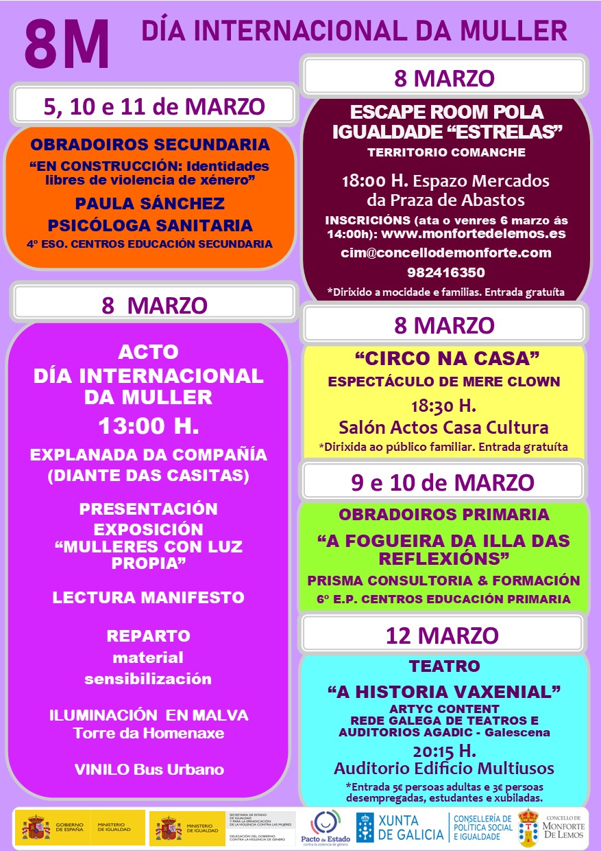 O Escape Room forma parte da programación do 8M organizada polo Concello de Monforte a través da Concellería de Muller e Igualdade. O acto central desenvolverase o propio domingo, 8 de marzo, coa tradicional concentración e lectura do manifesto ás 13.00 horas, diante das Casitas. Neste acto presentarase a Instalación Expositiva “Mulleres con luz propia” que permanecerá pendurada nas farolas da marxe dereita da Rúa Cardeal, dende a esquina coa Avenida de Galicia ata o final do Paseo da Compañía. Así mesmo, repartirase entre o público asistente material de sensibilización serigrafiado coa imaxe representativa da exposición.