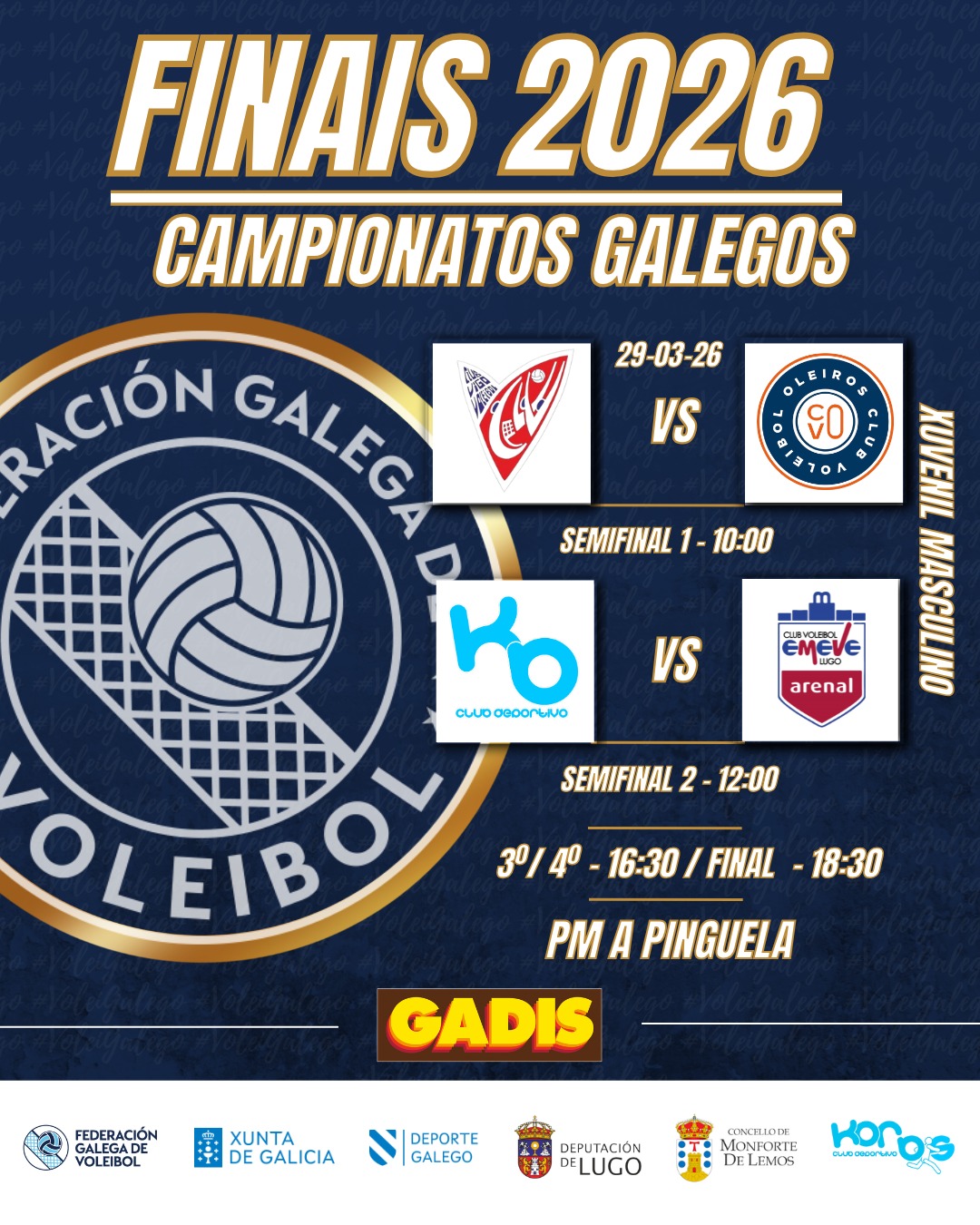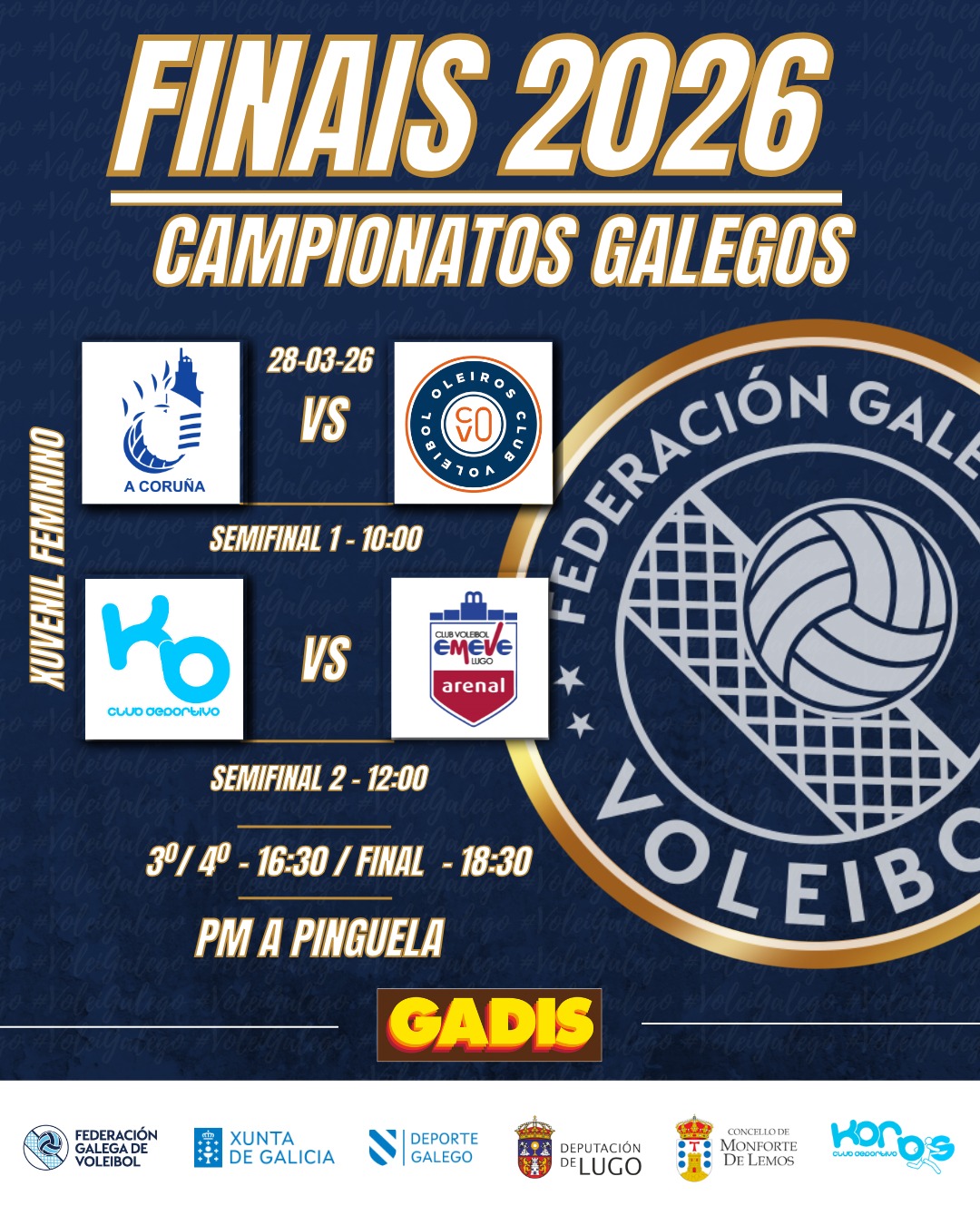 O sábado 28 xóganse as Finais Xuvenís Femininas, coa participación do Korbis Lambetadas, Arenal Emeve Lugo, CV Oleiros e CV Cidade de A Coruña. E o domingo 29, na Final Xuvenil Masculina, enfróntanse o Korbis Lambetadas, Arenal Emeve Lugo, CV Oleiros e CV Vigo.