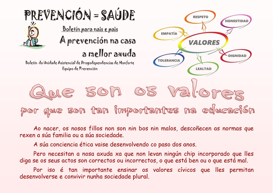 Ao nacer, os nosos fillos non son nin bos nin malos, descoñecen as normas que rexen a súa familia ou a súa sociedade. A súa conciencia ética vaise desenvolvendo co paso dos anos. Pero necesitan a nosa axuda xa que non levan ningún chip incorporado que lles diga se os seus actos son correctos ou incorrectos, o que está ben ou o que está mal. Por iso é tan importante ensinar os valores cívicos que lles permitan desenvolverse e convivir nunha sociedade plural.